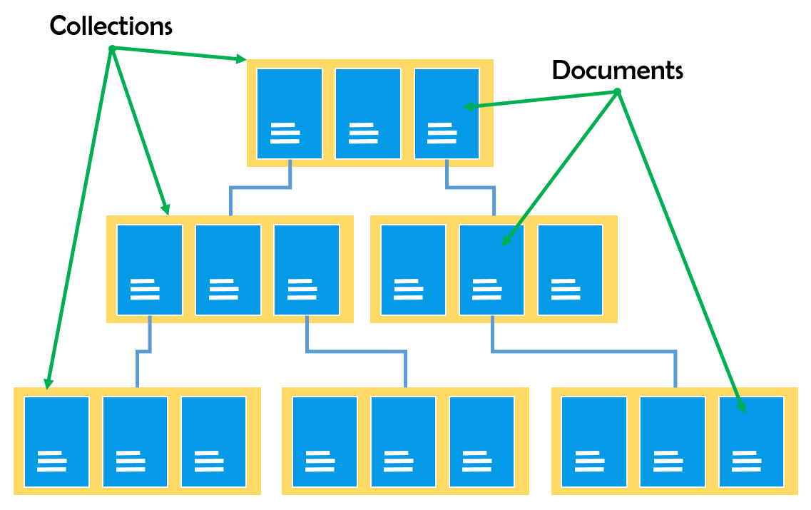 그림 6과 같이 컬렉션이 있고 그 속에 다큐먼트 들이 존재하며, 각 다큐먼트는 1MB이상의 용량을 가질 수 없고, 컬렉션 속에는 다큐먼트만 들어갈 수 있으며, 다큐먼트는 서브컬렉션을 가리킬 수 있습니다. 마지막으로 root 위치에는 컬렉션 만이 올 수 있습니다.